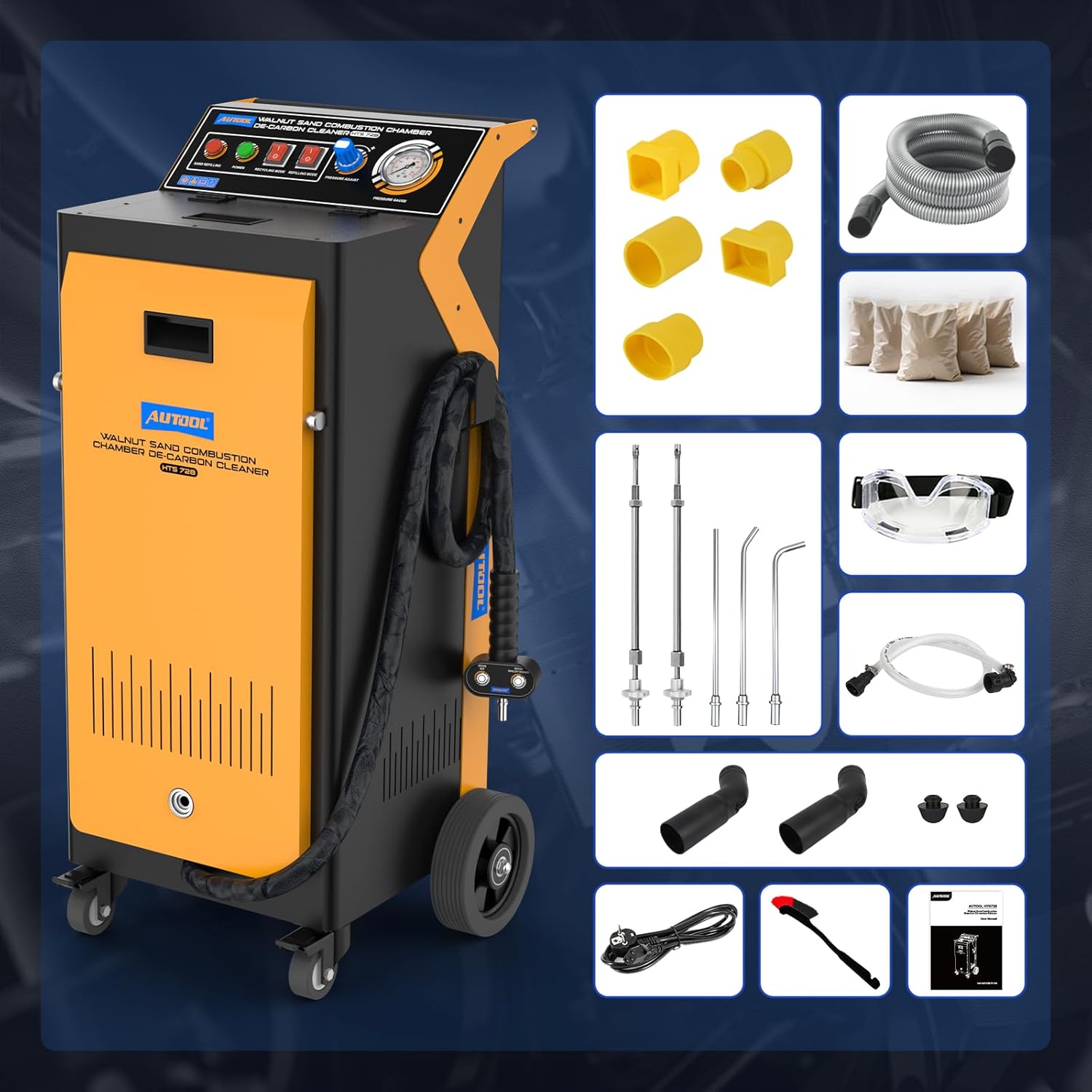 The AUTOOL HTS728 Walnut Blaster is a powerful 1500 W carbon cleaning machine designed for professional workshops and car enthusiasts. Using fine walnut shell media, it effectively removes stubborn carbon buildup from the combustion chamber, intake valves, and manifold without dismantling the engine. Its dual-mode operation allows simultaneous blasting and vacuum recovery, ensuring a clean and efficient working process.