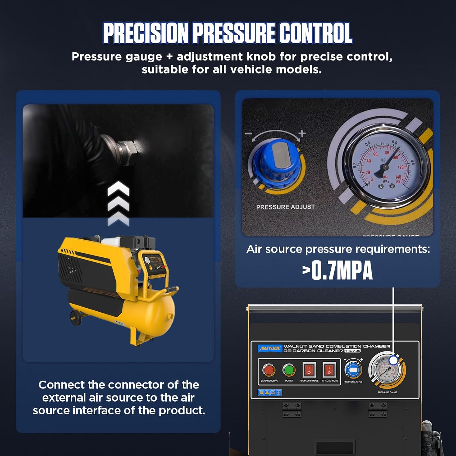 The machine features adjustable pressure control, multiple nozzles and adapters for various engine types, and a built-in filtration system that separates and recycles the walnut media for repeated use. Suitable for both petrol and diesel engines—especially GDI and turbocharged engines prone to carbon buildup—it restores engine performance, improves fuel efficiency, and reduces emissions. With a solid 10 L capacity, mobility wheels, and a durable design, the HTS728 is a reliable solution for modern engine decarbonization.
