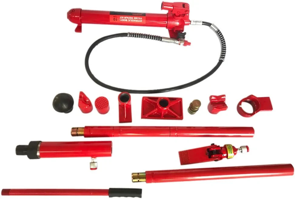This kit includes multiple attachments and extension tubes, providing versatility for different repair jobs. The hydraulic pump is designed for smooth operation and precise control, while the heavy-duty hoses and connectors ensure safety and durability under high pressure.