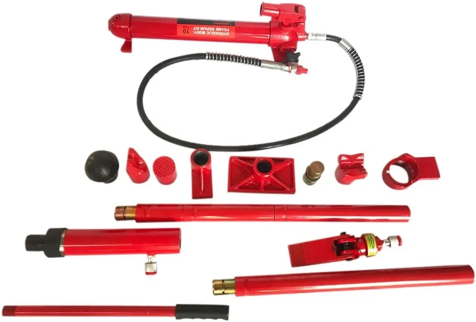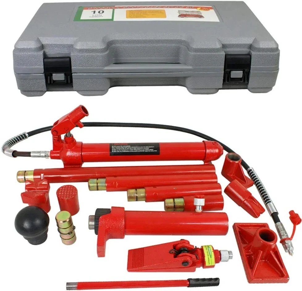 10T hydraulic porta power jack for lifting, pushing, pulling, bending, and straightening in automotive and industrial applications.